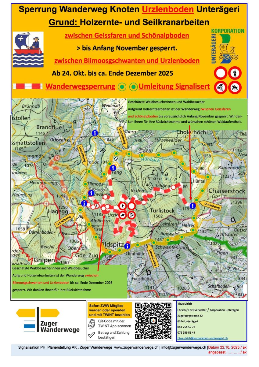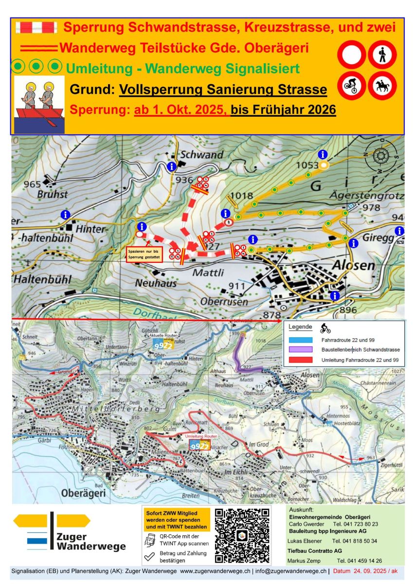 Sperrung Schwandstrasse, Kreuzstrasse, mit den zwei Wanderweg Teilstücke Gde. Oberägeri